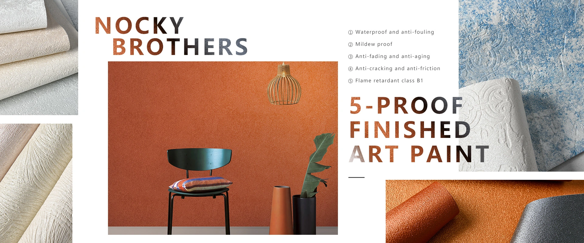 Nocky Brothers New Materials (Wujiang) Co., Ltd. è stata fondata nel 2012, con sede a Suzhou, una filiale a Shaoxing e società controllate a Shanghai. Siamo specializzati nella ricerca e sviluppo, produzione e vendita di carta da parati, rivestimenti murali e pitture artistiche impermeabili a 5 strati, caratterizzate da prodotti minimalisti ed eleganti in tinta unita.